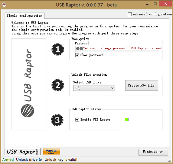 运行 USB Raptor 后会以简单模式显示,首先填入密码,这个密码是用于之后无设备解锁以及修改设置用的,然后在下面选择一个 USB 设备。这个 USB 设备无需被格式化,它的作用只是用来存放一个被加密生成的 .k3y 的文件而已,所以就将设备普及面大大提高了,之后点击「Create k3y file」生成密匙文件。这里当生成完毕后没有提示,如果你发现自己的设备里有一个 .k3y 文件那就是生成完毕了。最后勾选下面的「Enable USB Raptor」让这小工具运行保护起来。