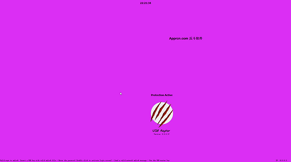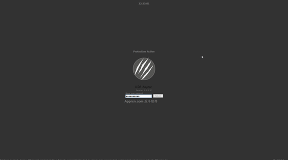 现在你可以尝试将 USB 设备拔下,然后 USB Raptor 会接管系统并显示一个锁屏画面。在该画面内鼠标还能动,键盘还能动,但是无法看到桌面。现在你将带有密匙的 USB 设备连接上电脑,如果匹配的话,USB Raptor 就会对系统进行解锁。
