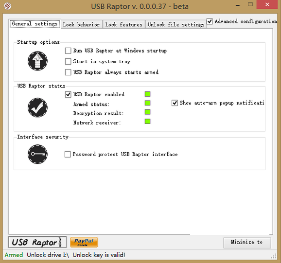 USB Raptor 还有一个高级设置模式,勾选上右上角的「Advanced configuration」就会显示的了。在「General settings」里,可以设置 USB Raptor 是否随系统启动,并且是否一直起保护作用。如果你选上了,那么当系统进入桌面后,发现有匹配的 USB 设备已经连接上,那么就会显示正常的桌面,如果发现没有 USB 设备插上,那么就会进入锁屏界面。而「Interface security」就是前面提到的是否用密码来保护设置界面。