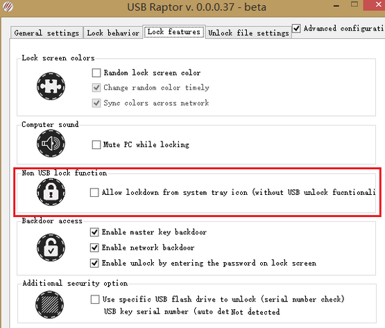 在「Lock features」标签页下,「Backdoor access」中的「Enable unlock by entering the password on lock screen」默认是勾选上的,这个功能是能够让你在锁屏情况下通过输入密码来进行解锁。而上方的「Non USB lock function」则是可以通过 USB Raptor 的托盘图标来进行锁屏,而不同拔下 USB 设备,这两项配合起来会有很多中玩法。