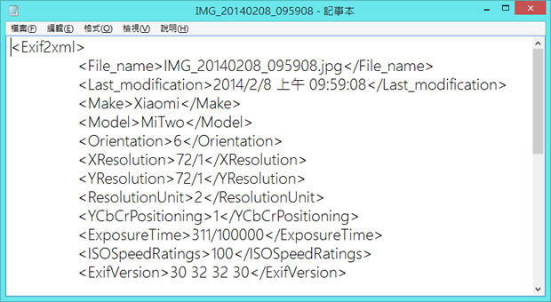 1.解压缩所下载的档案,执行“exif2xml.exe”便可开启,无须安装。开启后,将相片使用滑鼠拖拉到介面空白处,即可显示该张相片的 EXIF 资讯,点击上方有 XML的按钮,便可转出。
