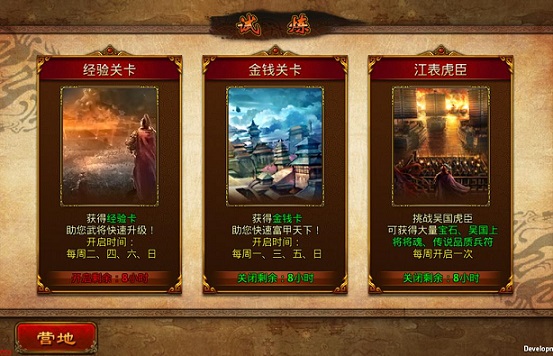 仙人之秘:开放时间周一4:00至周二中午12:00,玩家将挑战华佗、左慈、南华、张道 陵、于吉、管辂;除了掉落对应的将魂外,还可获得传说品质的书籍;