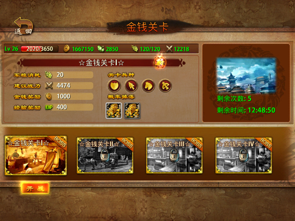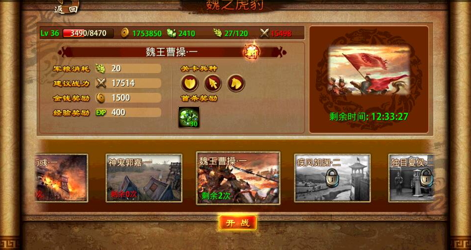 点击战役副本后,进入具体的战斗关卡,首杀通过的关卡,再次攻打时,可以使用“扫荡”功能;