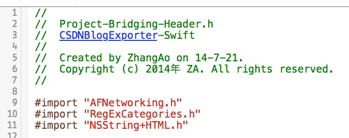 Swift与Cocoa和ObjC交互比较简单,只用Bridging(桥接)一下就行了,具体的做法是使用Bridging Header文件,这个文件不管是Xcode自动生成的还是自己手动添加的都可以,一般这个文件为:ProductName-Bridging-Header.h: