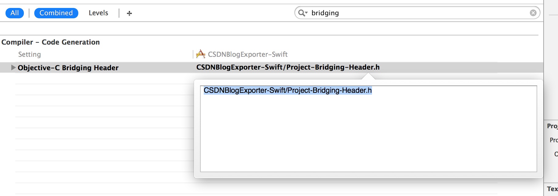 然后找到Build Settings,搜索Bridging,把Bridging-Header.h文件添加进去就可以了:
