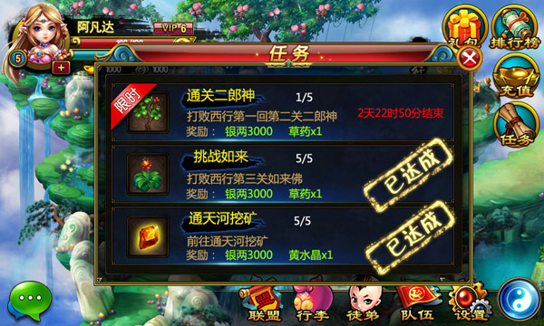 《放开那和尚》精心准备了大量的任务给玩家,有奖励丰厚的新手任务,轻松完成的每日任务,还有持续的主线任务,这些任务奖励的资源都是非常不错的,新手玩家千万要记得经常查看自己的任务信息哦。