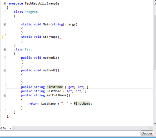 安装VsVim之后,您现在具有使用其快捷键绑定设置完成某些特定任务的选择。这些绑定是可配置的,因为您可能会想要使用固有的功能用于某些键,这些键与vim 替换截然相反。当VsVim安装时,出现图B中显示的选项按钮。当选项按钮被选中的时候会显示图C中的选项窗口。当VsVim首次在我的计算机上安装时, 在代码窗口出现如图 D显示的信息— 其主要是告知我在Visual Studio和VsVim之间有键盘绑定冲突,其想要让我进入选项窗口以解决这些冲突。选项窗口局限于在VsVim扩展和其Visual Studio主机之间的键盘绑定重叠部分。
