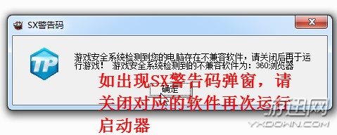 4、如出现SX警告码弹窗,请关闭对应的软件再次运行启动器