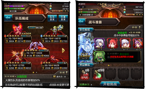 战前准备:在战斗开始之前,可将队伍重新编组分配、任命队长(不同队长根据队长技的不同,可带来不同加成效果);一切准备就绪后,带足药水,冲吧!