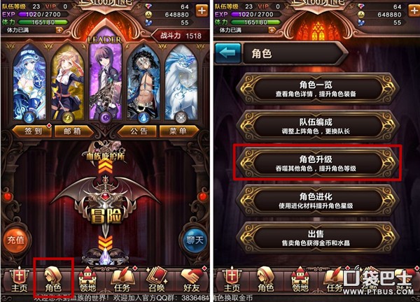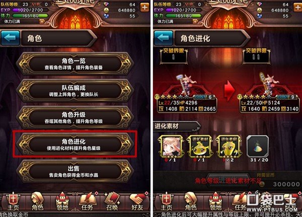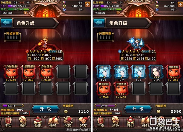 选择吞噬卡牌的话,可依次点击“角色”-->“角色升级”-->选择需要升级的角色-->选择被吞噬的角色-->点击“强化”。在此升级体系中,选择吞噬相同属性的角色,将获得1.5倍的经验值,转化率大大提升,所以大家应尽量避免吞噬非同属性卡。
