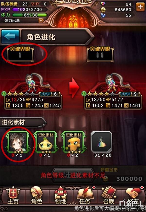 有高星潜质的低星卡可通过“角色进化”来提升星级,进化后角色增加一星级,等级、装备、潜能保留而必杀技将重置为Lv.1级。进行角色进化有一系列必要条件需满足,首先角色进行升星之前需要先将界限满破,并达到等级满级,而后还需拥有进化所需的所有素材。当升星条件未满足时,进化界面将有所提示。