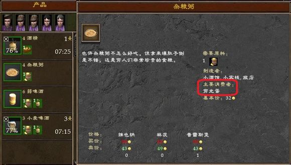下面说说酒馆自带民生产品,杂粮粥、弱啤酒、小麦啤酒、大马哈鱼、烤牛肉,酒精是半成品无法直接卖,其他的功能性道具(蜂蜜酒等)暂不讨论。杂粮粥和弱啤酒作为1级就能生产的东西,非常优质,成本低产量高,初期城市中穷光蛋数量多的时候,它们的销量很好。但是不能抱着这两东西不放,之后城市会慢慢便得富裕,所以后面应该转型成2级酒馆的小麦啤酒、3级的烤牛肉,特别是烤牛肉,成本仅需2大麦1牛肉,50块不到的东西但可以卖两三百,暴利,唯一的缺点是产量较低,后期可以让所有员工全部生产烤牛肉。