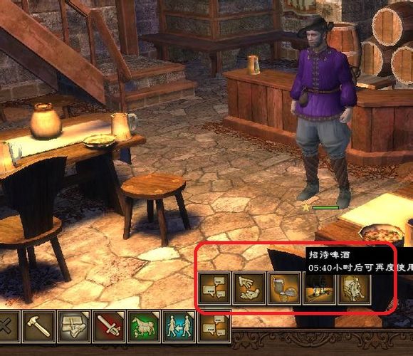 弱啤酒、小麦啤酒因为产量高,所以基本都是供大于求,那么多余的啤酒可以通过主角的技能来消灭掉。酒馆升到2级以后就有“招待啤酒”的功能了,把啤酒放到主角的个人物品栏里,然后就能拉到大街上叫卖了,利润非常高,但是技能有12小时的冷却时间,所以也别指望着靠它吃饭……如下图(早期版本技能冷却时间超短,那时候确实可以靠这技能吃饭-=)除此之外,这两种啤酒还能放在流氓职业的酒吧中销售,以后可能会提到……