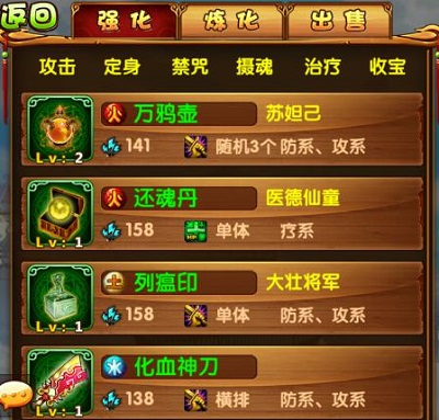 法宝按钮中,可以对武器进行炼化,和出售。武器好不好,就在这里决定了!所有的武器列表都在这里显示出来了。