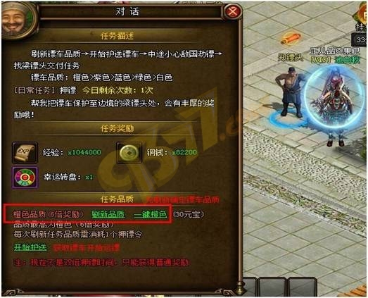 每日活动之国运押镖:任务地点在本国皇城(128,119)NPC郑镖头领取,传说中的押镖任务,其中也分品质的,品质越高奖励越丰厚,尽量将品质刷到橙色,刷镖令不够可以到商城用礼金购买,每天16:30-18:30押镖可以获得双倍奖励,值得注意的是:双倍时间段进行押镖的话会有很多玩家进行押镖,很有可能被其他玩家进行劫镖哦,当然如果对自身的实力很自信的话那这个时间段押镖就没什么问题,如果对自身不那么自信的话可以考虑换个人少的时间段。16:30-17:00这个时间段无论是押镖还是劫镖都建议多拉几个同伴一起,一来防止被劫镖,二来可以去劫别国玩家的镖车,组队劫镖也可以获得荣耀,VIP玩家还可以每天多押镖一次。