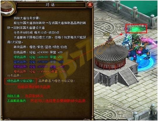 每日活动之太庙搬砖:这个活动不需要NPC,到其他任一敌国太庙(99,152)获取砖头,然后到本国太庙拿奖,品质越高奖励越丰厚,12:30-14:00是双倍奖励时间。
