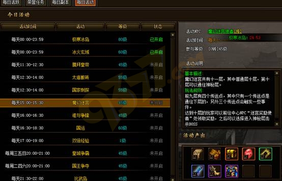 每日活动之魔幻迷宫:玩法介绍以及活动参见下图,奖励很丰厚,还能获得橙色精华,因此该活动是每日必做活动。前十层越多同伴参加越好,每进到一层都要记住这一层的传送点,因为如果进错传送点的话是有可能退回前一层甚至更多层。到达10层后可进入神秘层的击杀BOSS,BOSS还是有一定的难度,而且周围还会有许多其他国家玩家,神秘层是可以进行PK的,因此的话想安全通过神秘层的话还得需要组织更多的伙伴共同完成。