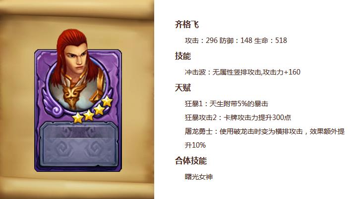 齐格飞是北欧神话中登场的屠龙勇士,沐浴龙血后刀枪不入,乍一听背景故事像是个肉盾类英雄,其实一点也不硬,从初始技能的伤害值,到初始三国数值,都比我们钟爱的猴哥低一点,但这并不妨碍他成为一个好用的英雄,毕竟,人家是新手任务中用KO积分兑换的,你不想要都不行。合体技能中的曙光女神,只需与初始阵容中的欧若拉和斯巴达战士同时在场即可释放,威力比三连强袭高了500点,相当不错。