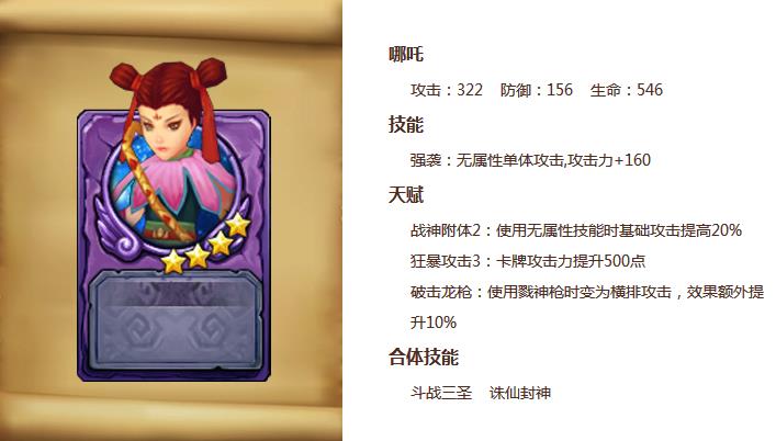又一位中国神话中的小将来到了游戏中,关于哪吒各种翻江倒海、拨皮抽筋的顽劣事迹这里不再赘述了。首先,初始技能攻击力增加虽然高达160点,但毕竟是个单体技能。看来在《众神之光》中,三太子也依然摆脱不了被孙悟空压制的命运,唯一的亮点是后面的合体技能仙封神,可以对横排敌人造成释放英雄总攻击力5%+2000点的伤害。
