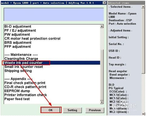 这时候我们看到下图所示界面,我们选择waste ink pad counter 然后点击下面的OK按钮;