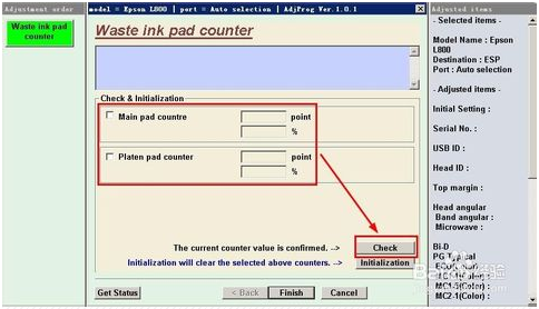 进入如下界面后,我们点击Check按钮,用以显示出废墨的使用比例,这样才可以对他进行清零;