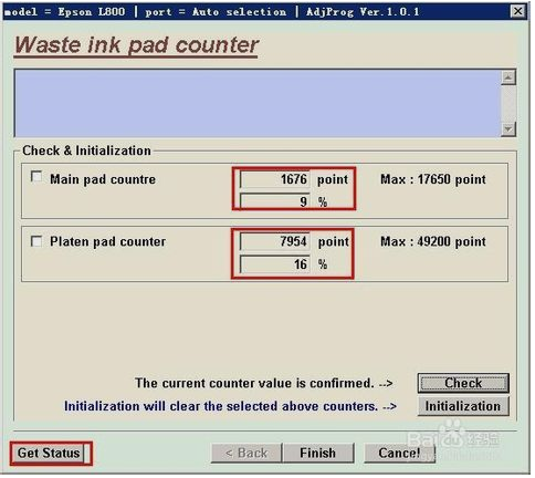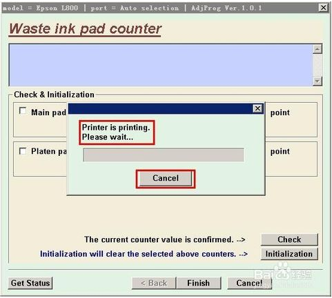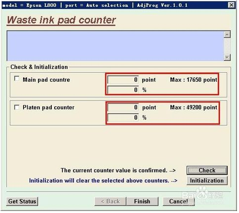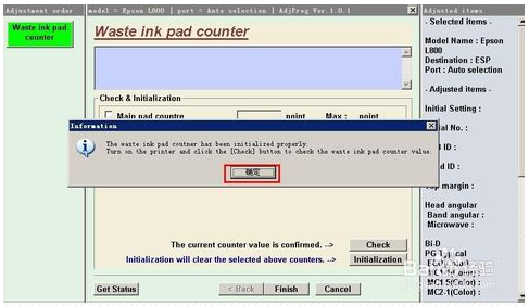 这时候我们把打印机开机,然后点击check按钮,已查看废墨量,这要等待几分钟时间,因为打印机开机后,维护软件需要认到打印机并读取芯片;