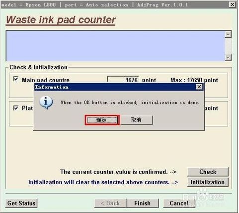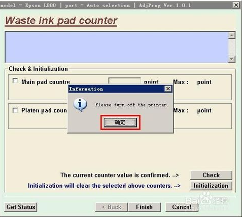 我们等软件读取出了打印机废墨比例之后,就可以点击chick下面那个按钮进入废墨清零过程;这时候软件会弹出如下对话框我们点击确定;