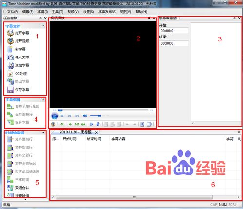 2、运行“时间机器字幕制作软件”,见面如下,主要分成6个区域。