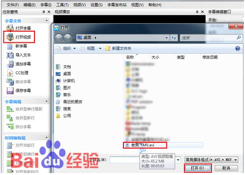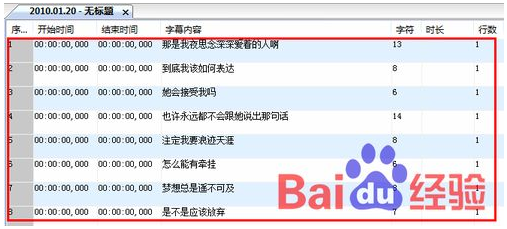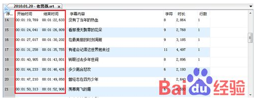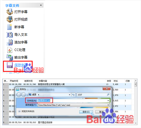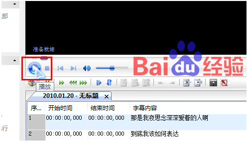 7、我们从头开始正式制作,停止视频后再重头播放,然后根据时间的MV歌声来确定每行字幕的时间,如果时间略有偏差,我们可以在字幕编辑区内(第2点中的3区域),对“开始时间”和“结束时间”进行精确的编辑,全部时间确定后,如下图。点击左上边的“保存字幕”按键弹出保存对话框,字幕文件的文件名我们保持和视频文件相同,然后保存,存放的位置和视频文件处于同一文件夹内(如果位置和名字不一样,转换的时候,字幕就不能够嵌入到视频中去了)。