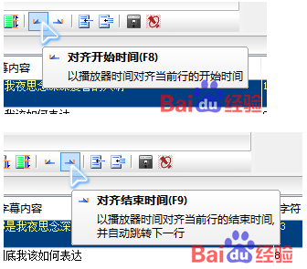 5、我们点击视频预览区的播放按键,下面的部分灰色按钮变成亮色。我们来认识一下比较重要的两个按键,“对齐开始时间(F8)”"对齐结束时间(F9)"这两个按钮,就是用来表示每一句字幕开始和结束时间的功能键。大家要记住这两个功能键的快捷键“F8”和“F9”,操作的时候尽量用快捷键,因为用鼠标点击的话有时候会点错的。