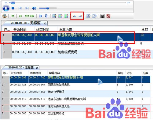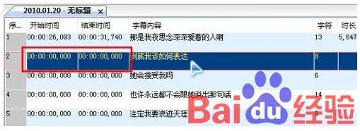 6、我们先选择一行字幕,然后试试做时间轴标记(选中的字幕行底色会变成深蓝色)。我用快捷键操作随意做了几行字幕的时间轴图中1--4行我是做过了,第5行外围有一个淡淡的红色框,这个是自动的,当你做完上一行的结束时间标记的时候,会自动换行到下一行字幕,红色的线框表示当前在标记这一行。