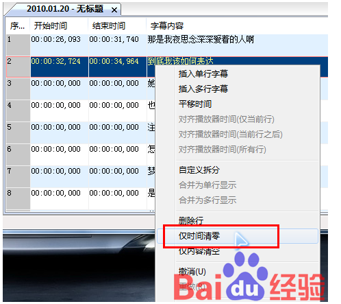 我们清零那几行随意做的时间标记,准备正式开始制作。清零的方法如下,右键你要清空的那行字幕,选择“仅时间清零”清零后如下图