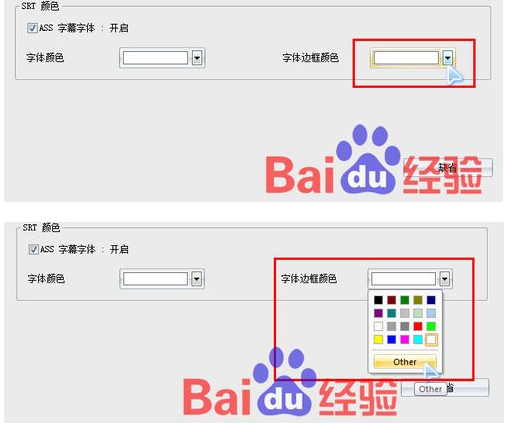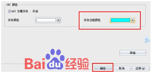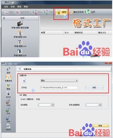 8、运行格式工厂,点击“选项”按键.选择“字幕字体”SRT颜色可以根据自己的喜好来设置,方法如下:点击下拉小箭头如果,出现的颜色不能满足你的需要,则点击下面的“other”弹出更多的颜色选择,选择好以后点击“ok”即可。退出来以后点击设置界面的“确定”。