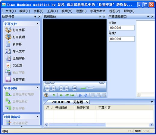时间机器字幕软件是由人人影视字幕组开发制作的视频字幕制作软件,该软件的使用很简单,插入视频后开始说话时按F8开始计时,一句话结束后按F9结束计时,在开始与结束期间内,输入视频中说话的文字即可,保存为SRT字幕文件后,字幕文件名与视频文件名必须相同,用支持字幕的播放器播放即可观看视频配字幕的视频。以下是具体的教程: