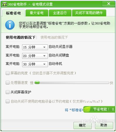 自动关闭不使用的电脑设备以节约电能(仅支持vista/win7)。你可以自定义设置省电方案的一些参数,让360省电助手更好地帮你省电。