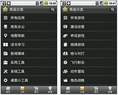3G安卓市场的整理了上千款国内外精品程序,并将它们分成了应用和游戏两大类,每个大类中还有十几项的小分类,涵盖了常用的各种软件以及多种类型的游戏,完全可以满足不同用户群体的需要。
