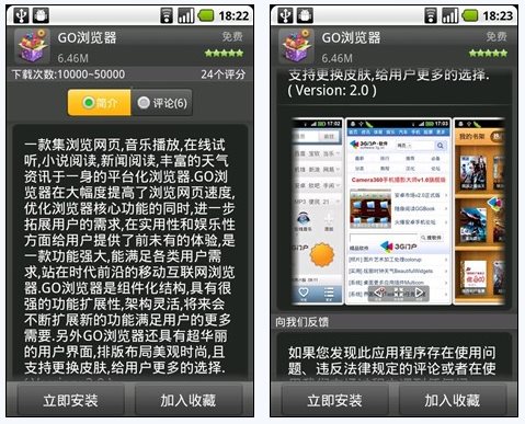 随意打开一个感兴趣的软件或游戏,程序简介马上映入眼帘,详细的介绍让你对它更了解,清楚的判断该程序是否是你需要的。轻轻的拖动屏幕,下面还有数张截图预览,图片丰富清晰,让用户对程序有了更直观的认识。还能查看评论,看看其他用户是如何评价的,最后决定是否下载或收藏,如果你使用了,请对它说两句,评价一番吧。