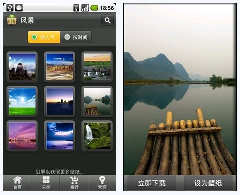壁纸栏目清爽自然,九张壁纸缩略图整齐的排列在屏幕中央,通过拖动屏幕可以看到更多的壁纸资源,壁纸可下载本地,也能直接设为壁纸,所有的壁纸都完美贴合你的屏幕,图片清晰细腻,效果很棒!