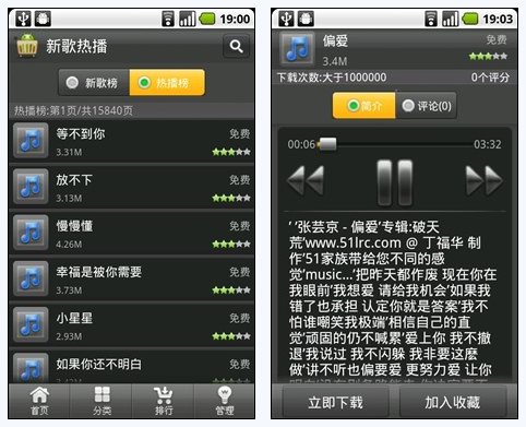 看看音乐排行的页数,足足有将近16000页,每页有十首音乐,这么庞大的资源库真是让人难以置信,数十万首火爆曲目等待您的聆听与下载。感觉最棒的还是在线试听功能,自动歌词匹配,歌曲缓冲速度很快,音乐试听过程不会中断,听后如果喜欢,还是下载到本地收藏吧!