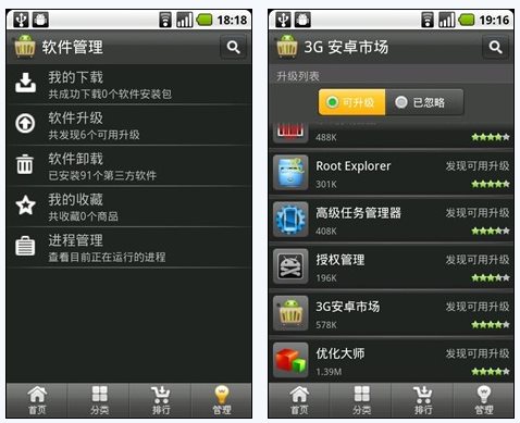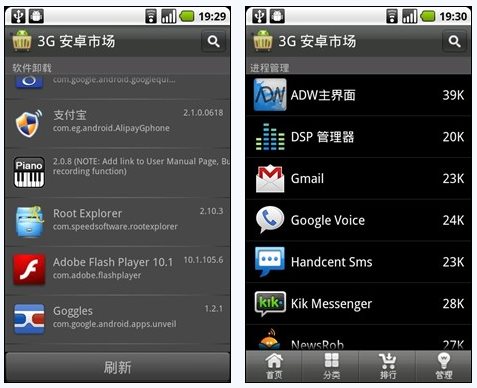 3G安卓市场打破了大家对原有电子市场的认知,开创了全新的电子市场模式,不仅能下载,还能管理。除了支持已装软件的更新提示外,3G安卓市场还集成了软件管理和进程管理模块,这也是用户最常用到的功能,即方便卸载无用程序,又辅助监控后台运行进程,下载、监管两不误。
