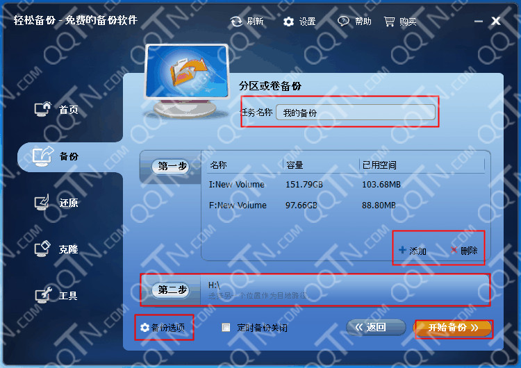 你可以通过点击“添加”按钮来实现一次备份多个分区或者卷,也可以通过点击“删除”按钮来移除你已选择的分区或者卷。