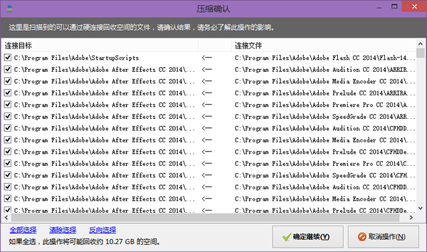 这时会弹出确认页面,显示了预计释放的空间以及即将连接的文件。可以看到……这次扫描可以释放超过10GB空间。