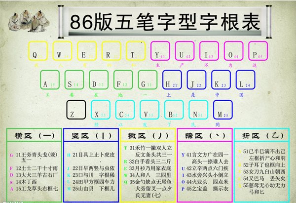 其次,五种基本笔划分布于键盘26个英文字母中的A到Y上,Z则用作学习键(也称万能键)。