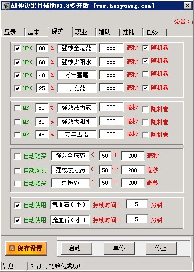 对于自动任务方面也有:自动双倍护送美女、全屏挖矿、自动售矿、禁地试炼、膜拜城主、伏魔圣地、日常任务、讨伐任务、一键10星任务、自动全民温泉、帮派篝火、夺宝奇兵、自动禁地试炼、自动合成装备、回收装备、小号多开练级65级等常用挂机功能!