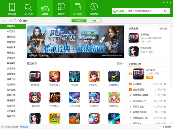 1.操作简便,不需注册登录,不管手机是否越狱,不用连接iTunes,下载安装苹果游戏和软件,一键完成。