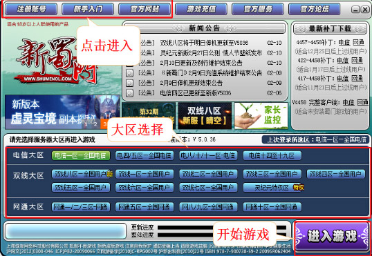 说明: 在左侧的服务器选择列表中,选择游戏大区,建议玩家依照自己的网络状况选择“电信”、“网通”或“双线”区,这样可以获得