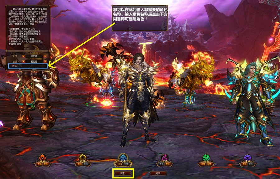 选择完职业后,别忘了给您的角色起个好听的名字哦!角色昵称可为数字、英文、汉字。人物名字确定后,点击人物下方的“进入游戏”按钮,马上开始您的《蜀门》之旅吧!