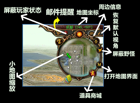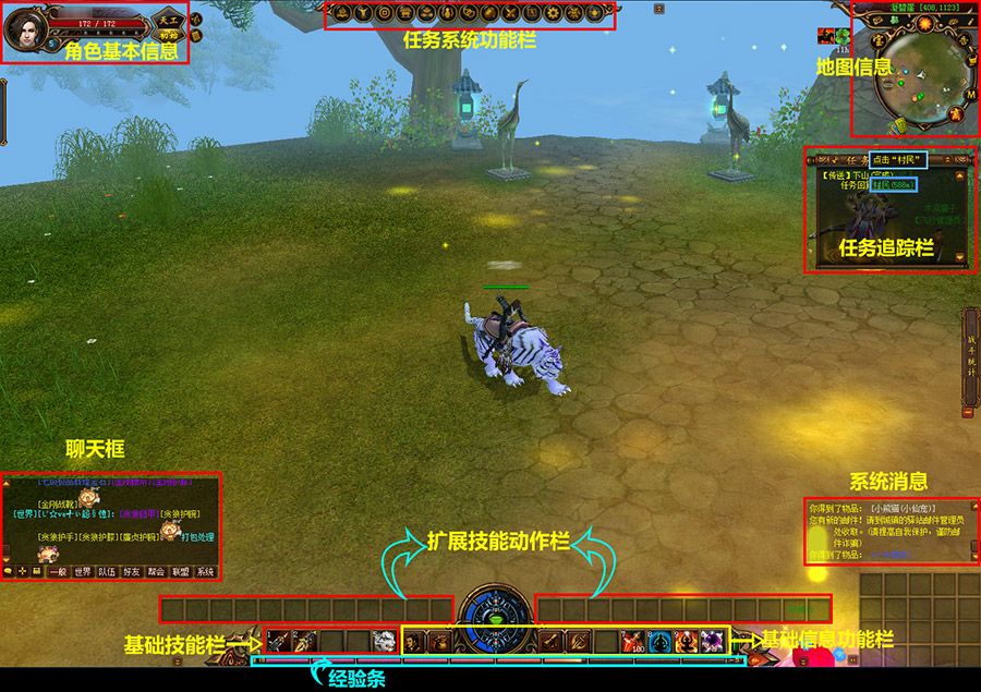 《蜀门》如下图游戏界面,游戏界面分为角色基本信息、任务系统功能栏,地图信息、任务追踪栏、系统消息、扩展技能动作栏、基本技能栏以及经验条等等。对应的位置如下图。
