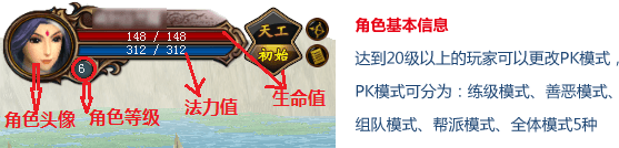 可在放大的下图中看到,该部分显示的是玩家人物的名称、头像、等级、血量与法力值。右键点击头像可以选择PK模式以及添加他人好友。