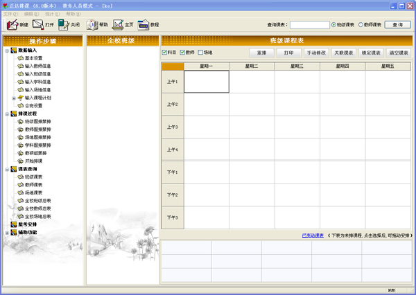 3、排课过程分四个层次:全校自动排课、班级自动排课、手动调课、完全自主排课。全校自动排课对全校的所有班级进行自动化的排课,用户可以多次执行全校自动排课命令以使排课结果符合要求。如果只是对个别班级的排课结果不满意,可以专门针对该班进行班级自动排课,以提高效率。也可以针对某班的课表进行手动调课。手动调课非常方便。只要按下鼠标采用拖动的方式,将某节课拖动到需要的位置,就能完成调课的过程。系统能智能化地检测对调的两节课是否发生位置冲突,并且给出信息提示以便于作出合理调整。在自主排课中,用户可在班级、教师、教学场地三位一体的固排禁排空间上,可以自主地确定每节课的位置,排课工作变得简单明了。